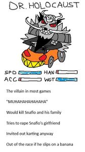 Dr. Holocaust was created by u/ReiceMcK. It is meant to be a satire/unholy fusion of bowser, Dr. Cortex and Eggman taken to the absolute most extreme end. He was first used in a "inviting the bad guy to go karting" snafu, mainly coaxing the Mario kart series.
